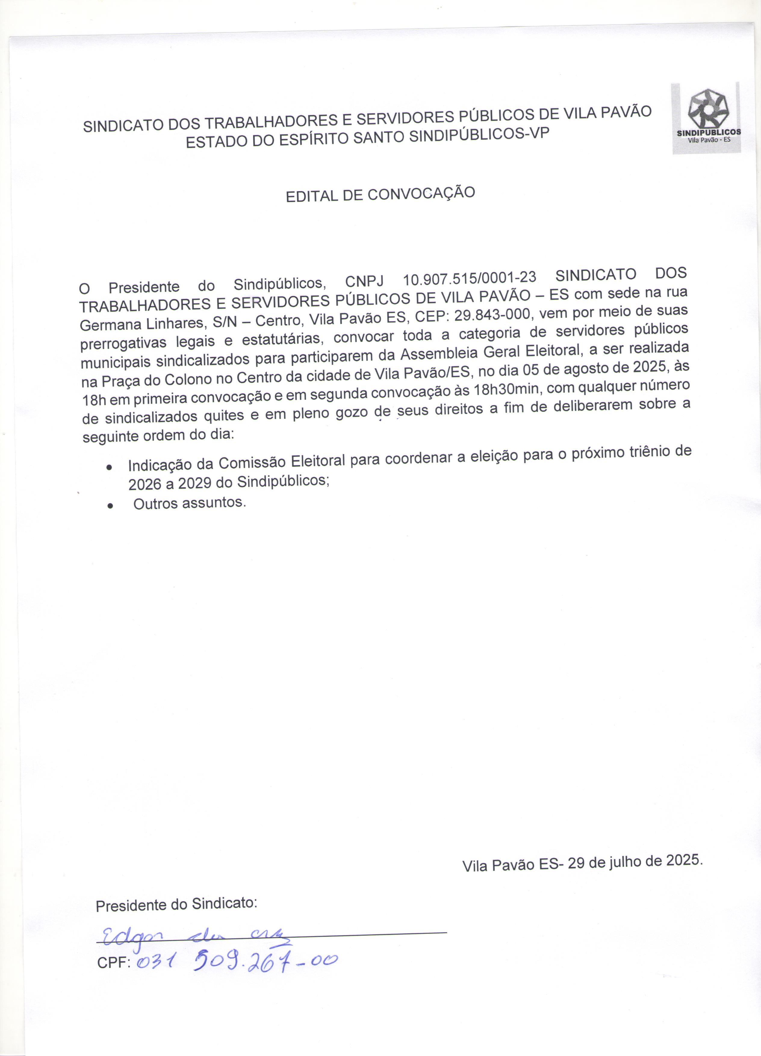 | Edital de Convocação Comissão Eleitoral (SINDIPUBLICOS-VP) | 30/07/2025 | VISUALIZAR |