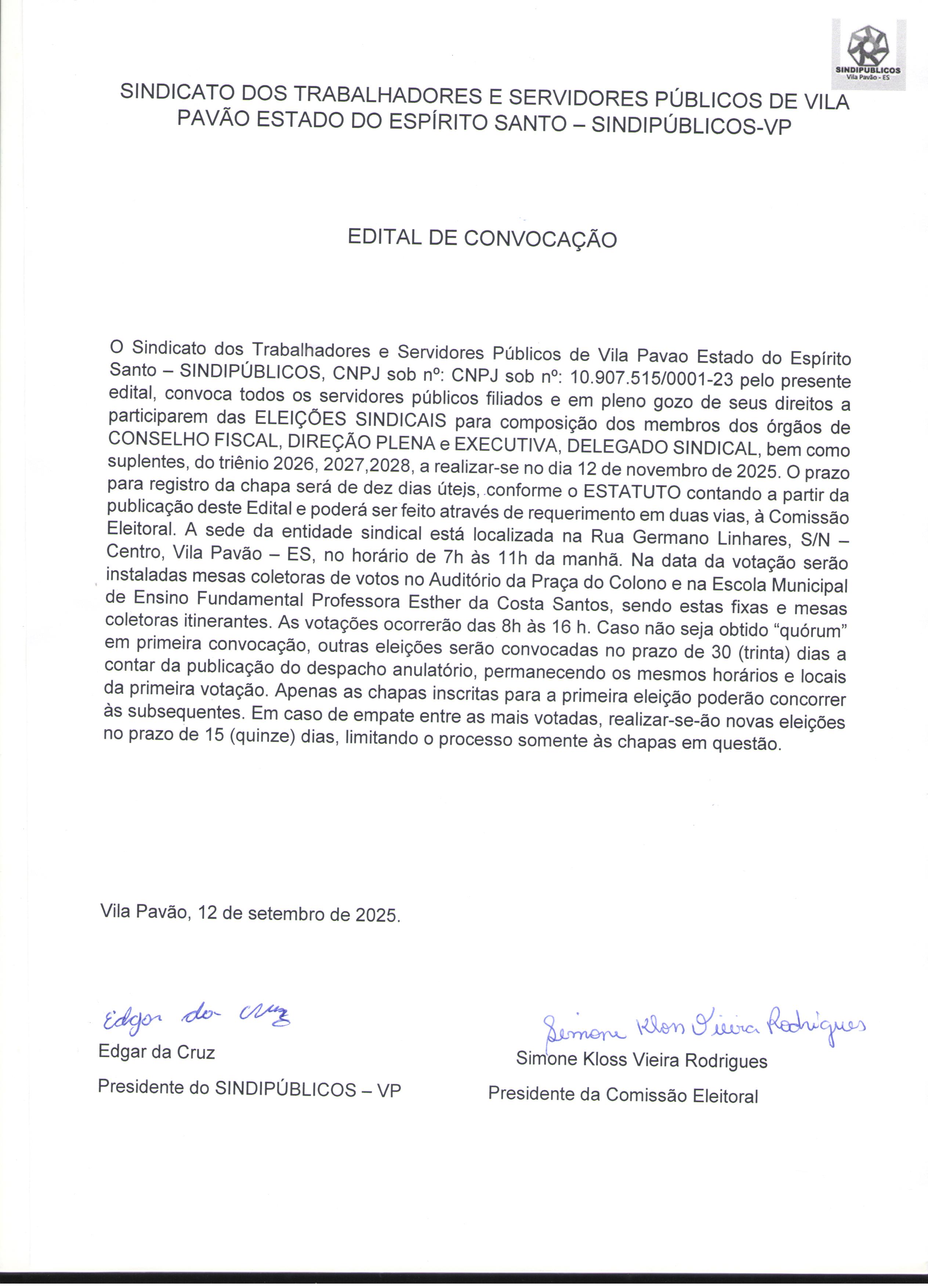 EDITAL DE CONVOCAÇÃO - ELEIÇAO SINDIPÚBLICOS - VP 16/09/2025 VISUALIZAR