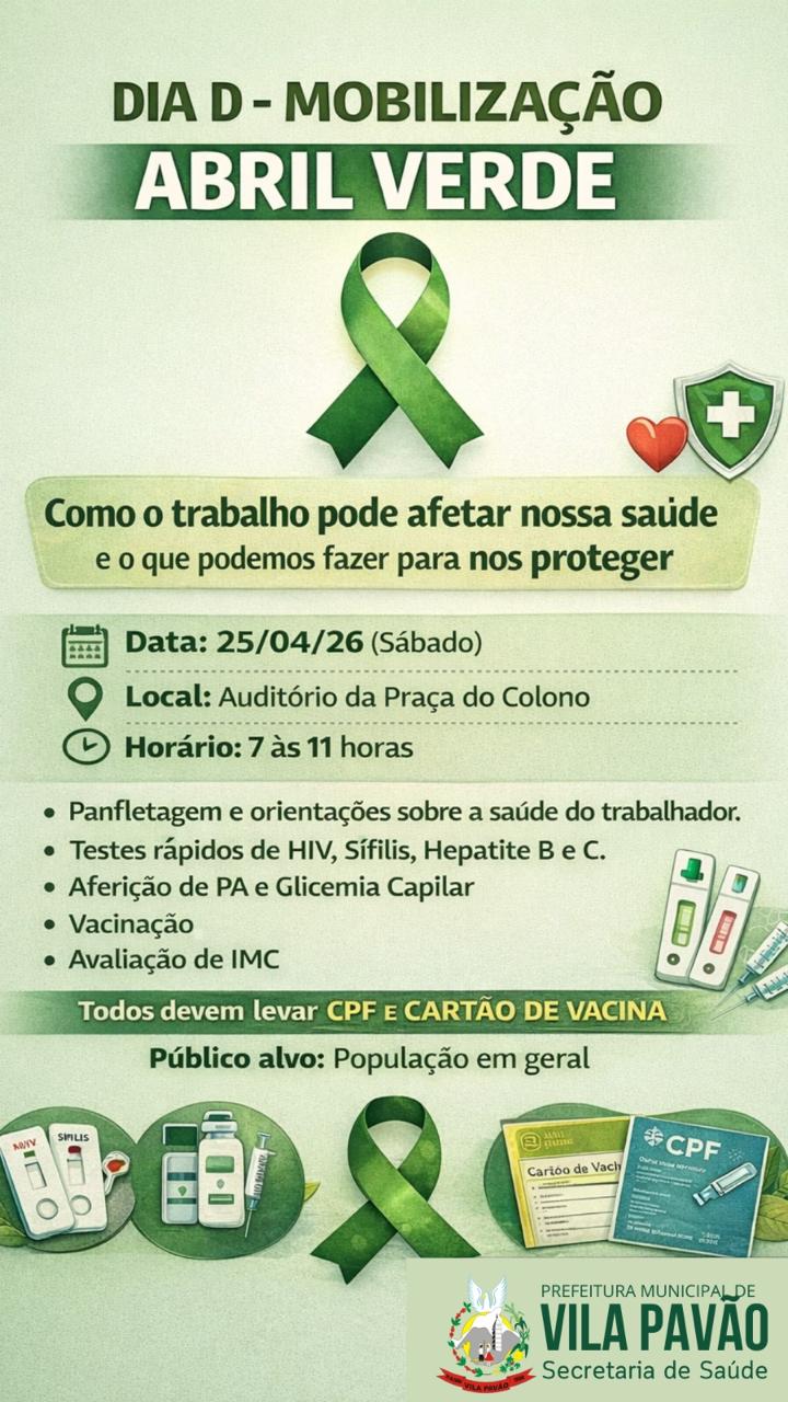 A Prefeitura Municipal de Vila Pavão, por meio da Secretaria Municipal de Saúde, promove no próximo dia 25 de abril (sábado) o Dia D – Mobilização Abril Verde, uma ação voltada à conscientização sobre a saúde e segurança do trabalhador.