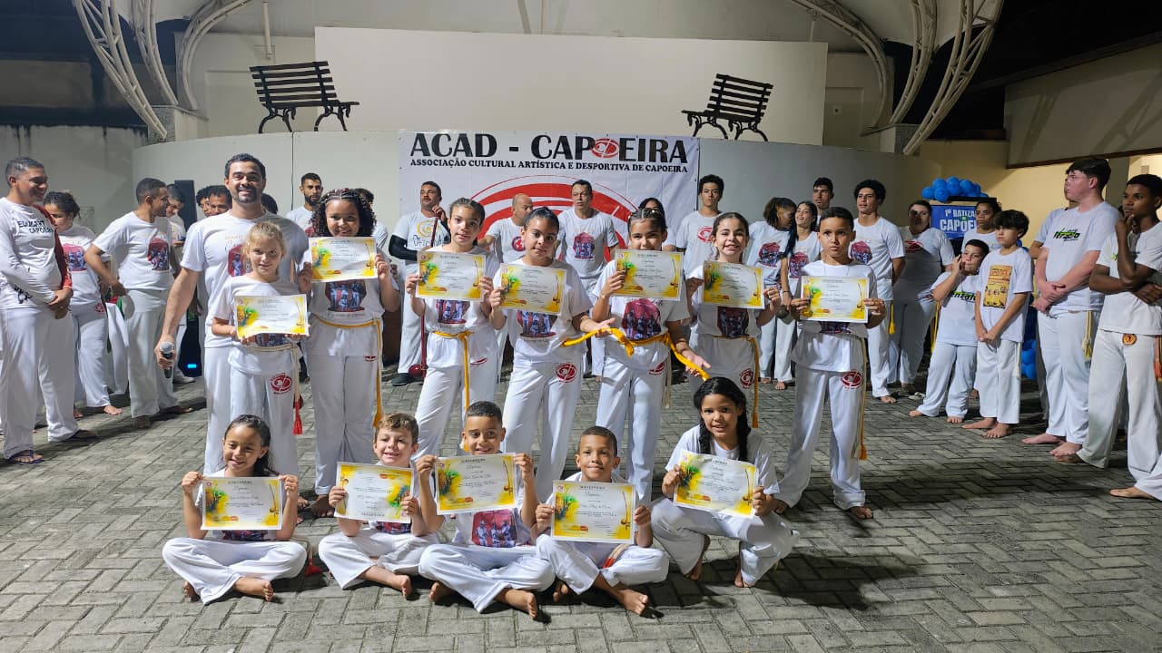O batizado de capoeira, realizado anualmente, é um momento simbólico de grande importância, onde os alunos são avaliados não apenas pela técnica, mas também pelo comportamento e evolução pessoal, reforçando os valores que a capoeira ensina dentro e fora da roda. A cerimônia marca uma etapa significativa na trajetória dos participantes, evidenciando o aprendizado, a disciplina e o compromisso desenvolvidos ao longo das atividades.